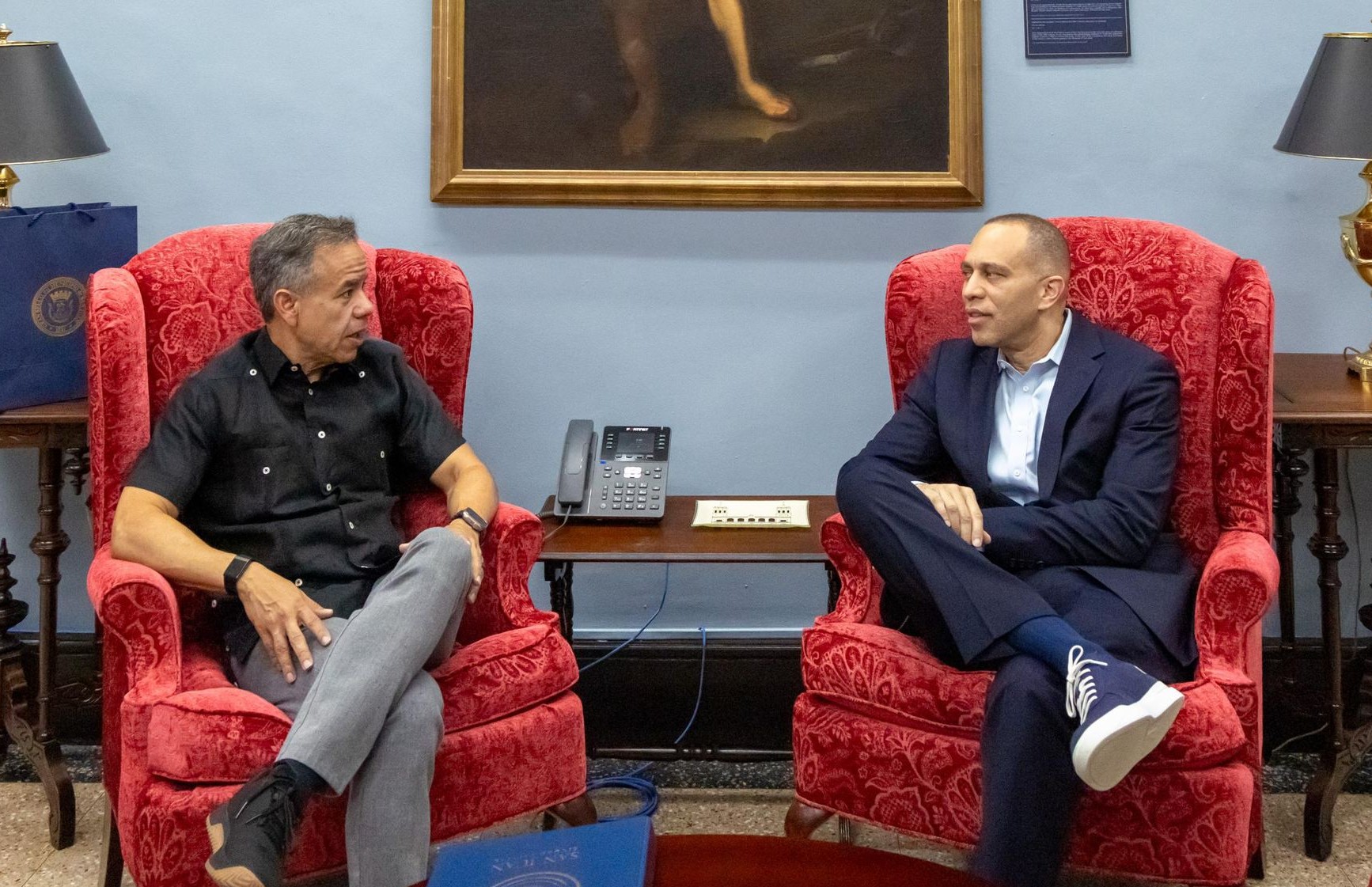 San Juan, Puerto Rico – El alcalde de la ciudad capital, Miguel A. Romero Lugo, recibió en la Casa Alcaldía a una amplia delegación de miembros del Congreso de los Estados Unidos como parte de un desayuno institucional enfocado en fortalecer las relaciones intergubernamentales y promover un diálogo directo sobre prioridades compartidas entre el Municipio y el gobierno federal. Previo al encuentro, el alcalde sostuvo una reunión en su oficina con el líder de los demócratas en la Cámara de Representantes de los Estados Unidos, Hakeem Jeffries, en la que dialogaron sobre asuntos prioritarios para la ciudad capital y Puerto Rico. El encuentro permitió un intercambio sustantivo sobre asuntos que impactan directamente a San Juan y a las necesidades particulares de la isla dentro del ámbito federal.
